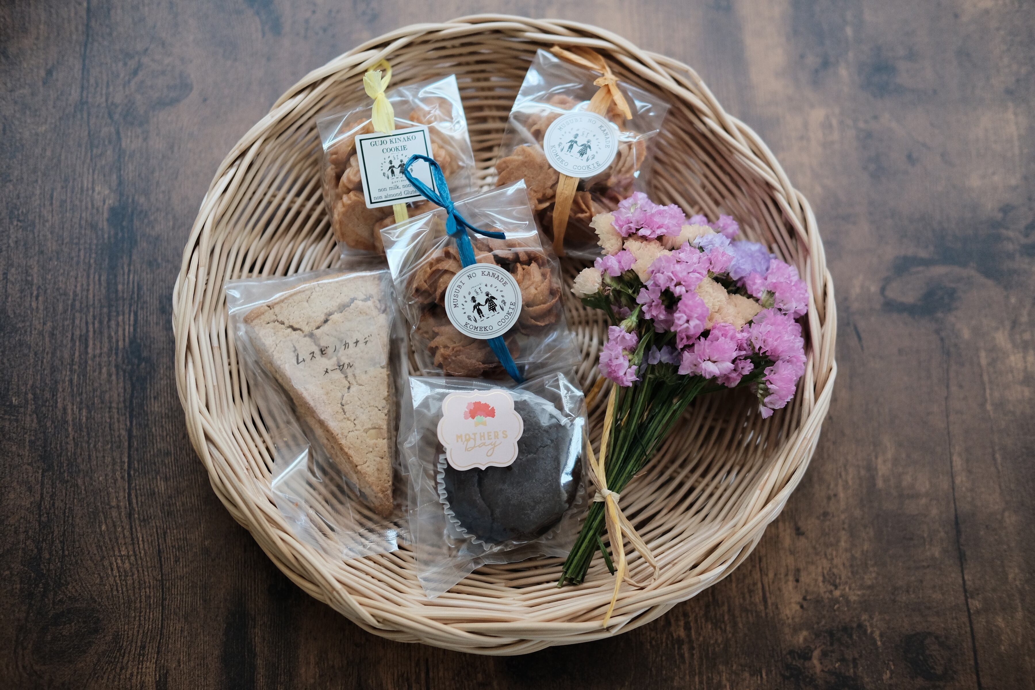 ムスビノカナデの定番焼き菓子5個と、ハナパレさんのスターチスブーケを詰めた、