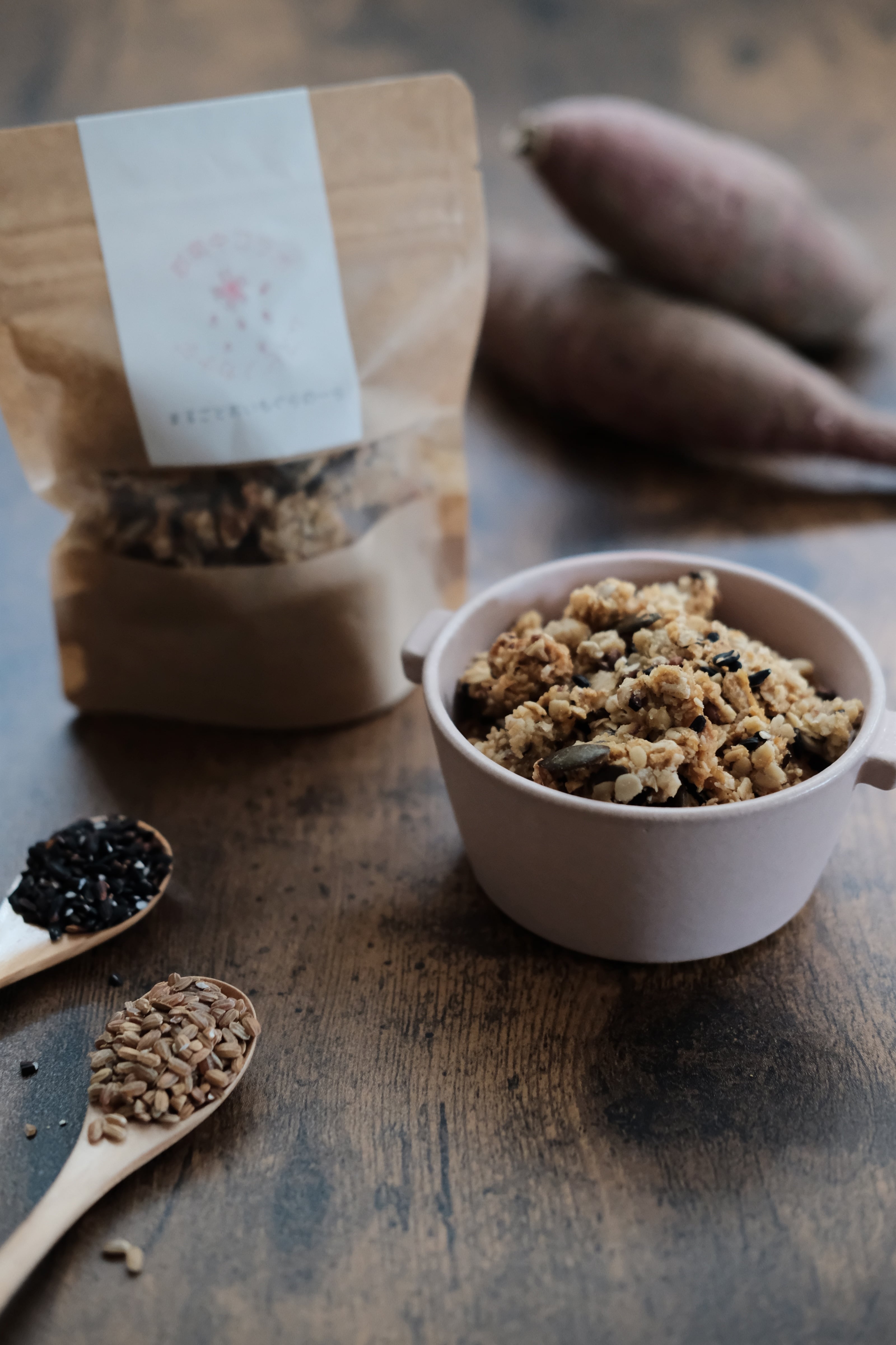 有機オートミール(アメリカ産)・米粉(岐阜県郡上産)・米油・てんさい糖・ひまわりの種・有機メープルシロップ・赤米・黒米・カボチャの種・塩